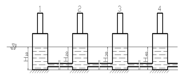 静力水准系统又称连通管水准仪,系统至少由两个观测点组成,每个观测点安装一套香蕉视频APP在线观看。香蕉视频APP在线观看的贮液容器相互用通液管完全连通,贮液容器内注入惰性液体,当液体液面完全静止后系统中所有连通容器内的液面应同在一个大地水准面上,此时每一容器的香蕉视频色在线观看由传感器测出,即初始香蕉视频色在线观看值分别为:H10、H20、H30、H40、如下图: