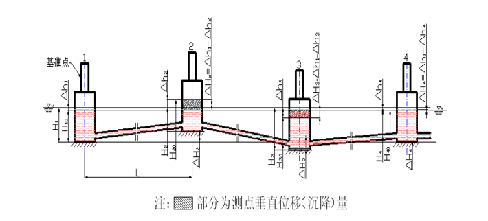 假设被测物体测点1作为基准点,测点2的地基下沉,测点3的地基上升,测点4的地基不变等等,当系统内液面达到平衡静止后形成新的水准面▽i0,则各测点连通容器内的新香蕉视频色在线观看值分别为:H1、H2、H3、H4,各测点香蕉视频色在线观看变化量分别计算为:△h1=H1-H10、△h2=H2-H20、△h3=H3-H30、△h4=H4-H40,当选定测点1为基准点,则其它各测点相对基准点的垂直位移(沉降量)为:△H2=△h1-△h2、△H3=△h1-△h3、△H4=△h1-△h4,如下图: